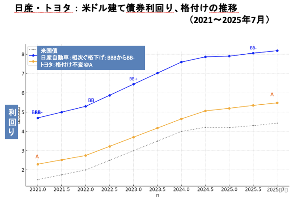 日産の信用格付け(クレジットレーティング) はピーク時(8-90年代)はトヨタとほぼ同格だった気がします。(下記が実際:トヨタが常に数段上でした。最高はA-) それが投資的格外、ジャンクレーティング(BBB-未満の債券は通常の機関投資家の購入が社内規定で認められておらず、投資適格か否やで、スプレッドにもかなりの格差があります。)まで行き、隔世の感ありです。
