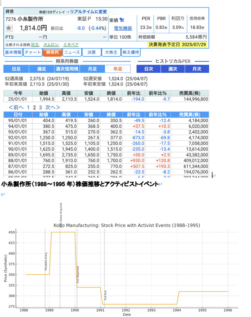 小糸製作所(1988〜1995年)株価推移とアクティビストイベント
