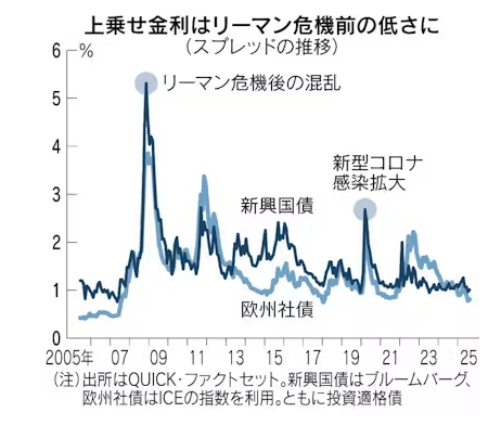 Oaktreeの最近の記事でも米国市場の信用スプレッド(米国債への上乗せ金利:リスクプレミアム)が薄くなるにつれ欧州市場の割安感、また、さらに信用リスクを取る動き、また、米国トランプの不確実性からのリスク回避の動きの一環として脱米国化が最近起きています。流石に日経の記事全てをこちらに載せるわけにはいきませんが、ぜひ、有料会員にはなられて金融リテラシーを高めて下さい。