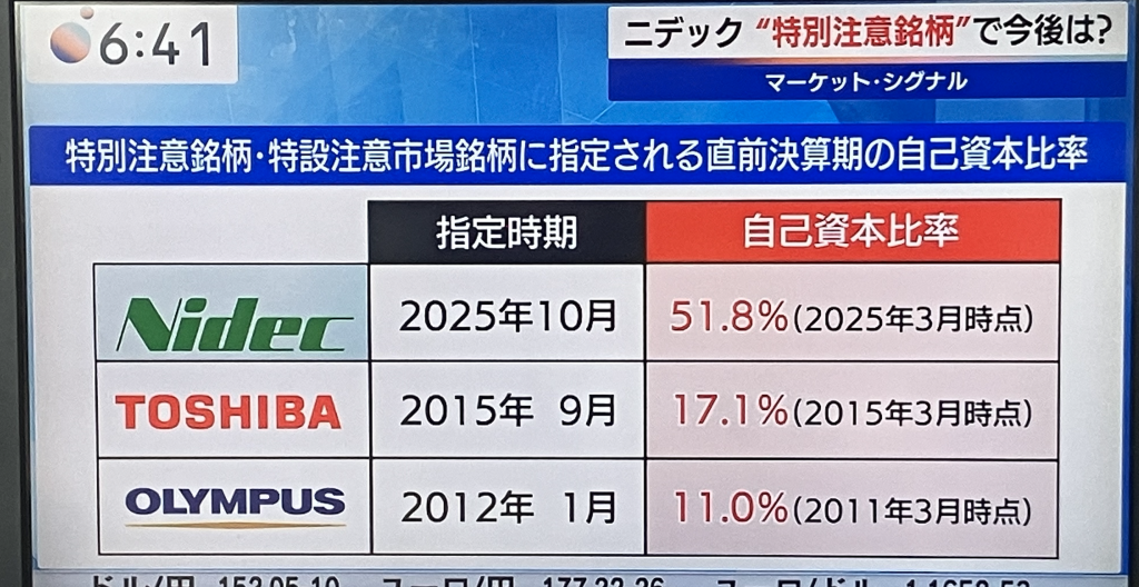 自己資本比率とは: 負債と株式資本の割合です。負債 / (負債+株式資本):東芝は負債と株式資本の割合が約1 : 4に対し、ニデックは1:1 かなり負債過多の度合いが低いので会社が傾くことはなかろうという意味です。が、上場廃止となると銀行ローン等にも様々な条項があり、余談は許さないと思います。