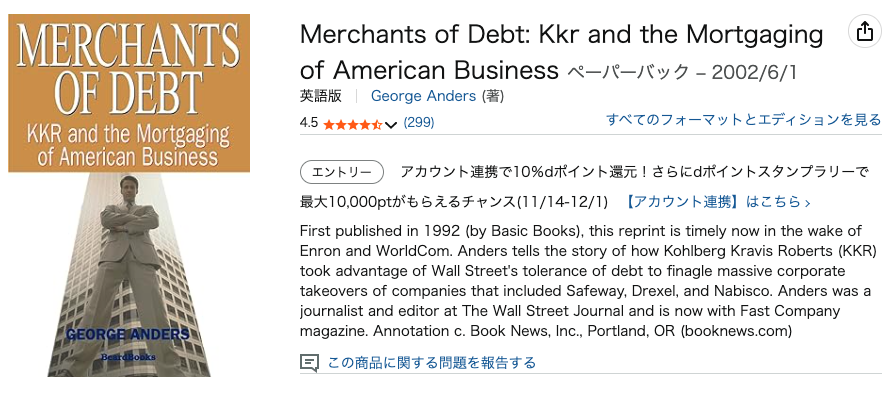 当初はKKRが、先行の感があったと思いますが、立場逆転、Merchant of Debtと言うKKR創業時の本(下記)は非常に面白かったです。ヘンリークラビス等創業者複数人がわざわざボストンまで出資交渉に赴くも、アポはすっぽかされ、大雨の中をとぼとぼ歩いているシーンなんて、起業家あるあるです!